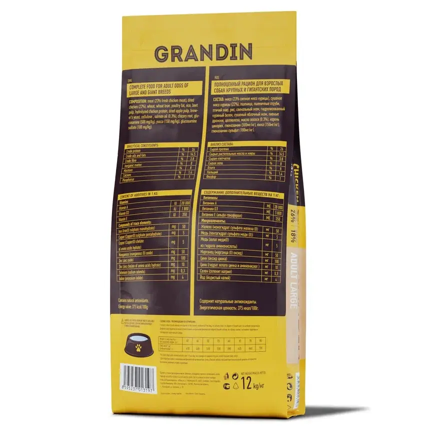 мясо (23% свежее мясо курицы), сушеное мясо курицы (22%), пшеница, пшеничные отруби, птичий жир, рис, свекольный жом, гидролизованный куриный белок, сушеный яблочный жом, пивные дрожжи, целлюлоза, масло лосося (0.3%), корень цикория, глюкозамин (500мг/кг), юкка (150мг/кг), глюкозамин сульфат (100мг/кг).