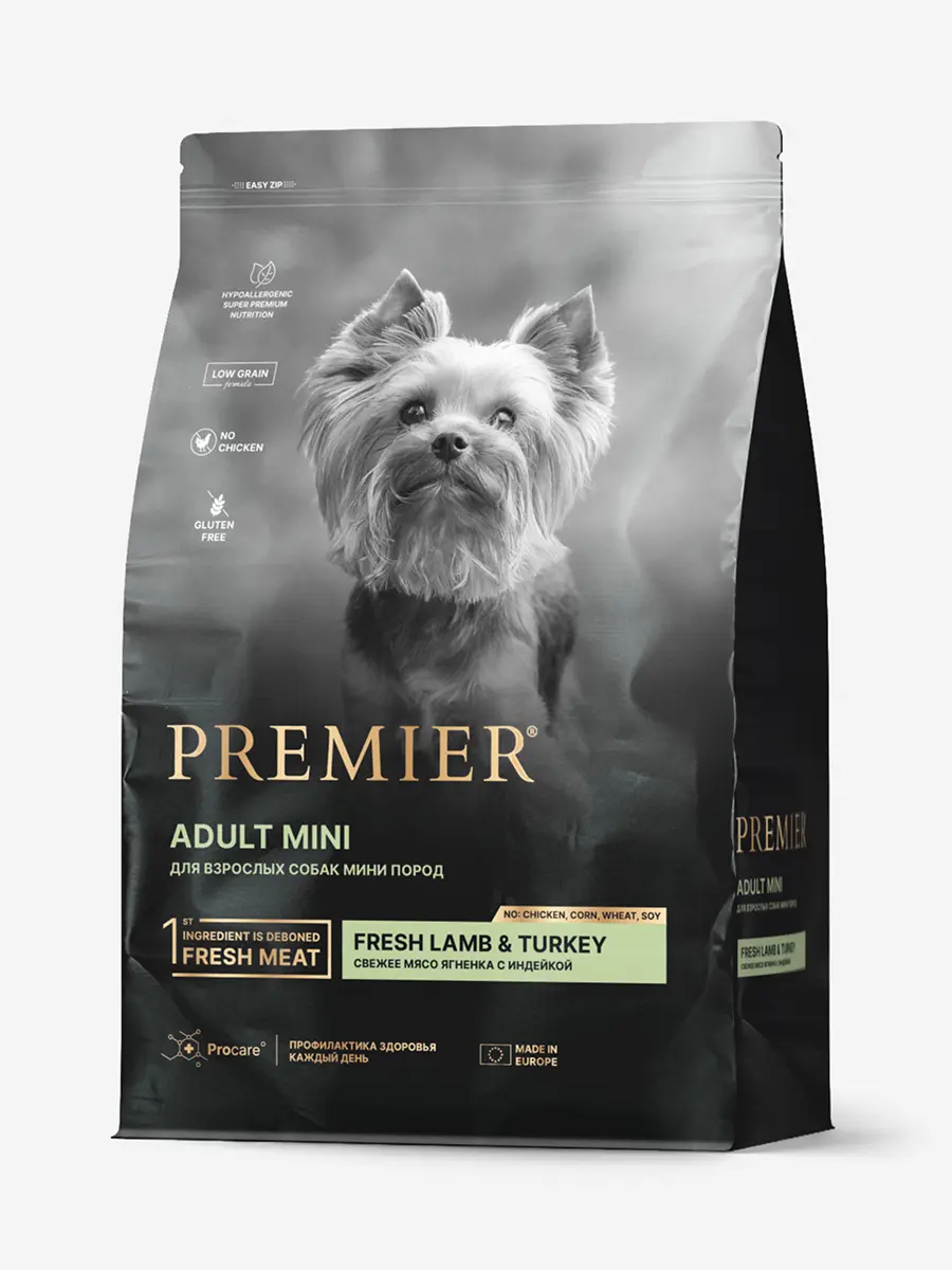 Premier Dog Lamb&Turkey ADULT Mini - корм для взрослых собак мелких пород с нормальной активностью, чувствительным пищеварением или склонных к аллергии.